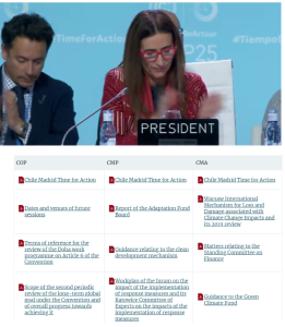 I numerosi tavoli negoziali paralleli riguarderanno principalmente altri punti tecnici relativi all’implementazione dell’Accordo di Parigi, dopo che nella precedente COP24 è stato approvato il “libro delle regole” (Katowice package).