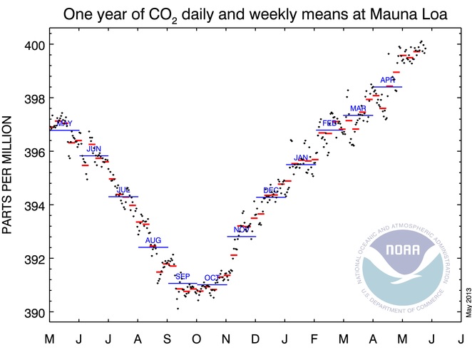 Il 9 maggio 2013, per la prima volta da circa 4 milioni di anni, la concentrazione giornaliera di CO2 atmosferico misurata a Manua Loa ha superato 400 ppmv. Lo stesso...